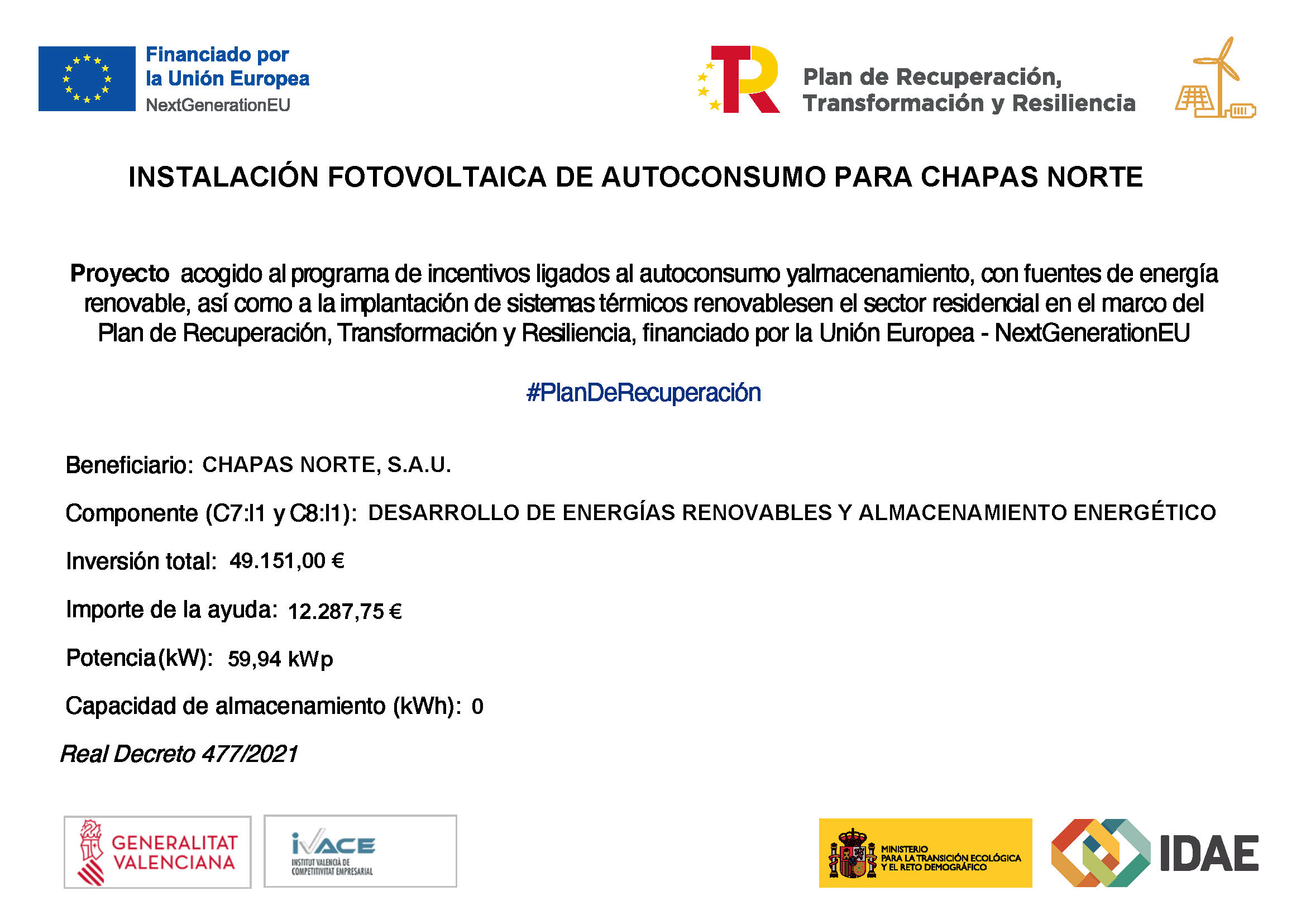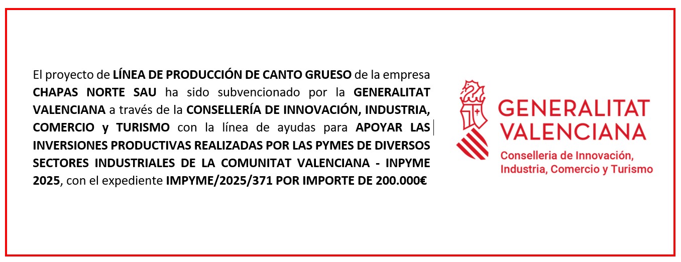 “Chapas Norte S.A.U. ha sido subvencionada por la Conselleria de Economia Sostenible, Sectores Productivos, Comercio y Trabajo con 21.982,22 € para la implantación de un sistema de gestión integral del negocio.”